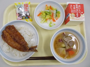 いわしのかば焼き丼牛乳白菜の甘酢和え豚汁黒糖福豆