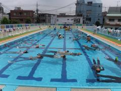 続いて、水着の上から長袖・長ズボンに着替え、プールへ入水します。