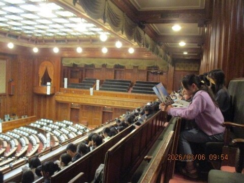 部屋の入口にかかっている札に「自由民主党控室」「中道改革連合控室」などテレビなどで目にする政党の文字などが書かれており、興味津々な様子でした。最後は衆議院議場を傍聴席に座って説明を聞きました。