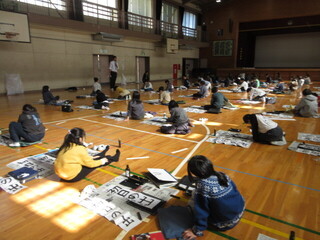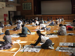 1、2時間目は6年生、3、4時間目は5年生が体育館で席書会を行いました。広い空間でいつもよりも大きな紙に筆を運ばせます。お手本を真剣に見ながら、文字と向き合う時間が流れます。書きあがった作品がどれもよく、提出する方を決めかね、「校長先生は、どっちがいいと思いますか?」「私は、この文字はこっちがいいんですけど・・・」など迷っている子がたくさんいました。がんばった証としての作品が完成しましたね。