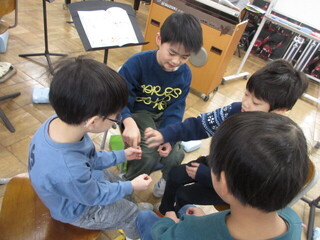 わらべうたに合わせて遊びながら、歌ったりおもしろさを見つけたりしていました。今日は、「すいすいすっころばし」です。知っている子もおり、とても分かりやすくみんなに伝えてくれました。遊びがはじまると、どのグループも盛り上がっています。