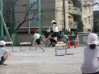 ハードル走の練習です。ハードル間の距離が異なる複数のコースの中から、自分がリズムよく越すことができるコースを選び、挑戦しています。友達の走る姿を見て、よさを見つけ、声をかけている姿もありました。
