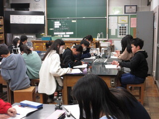 水溶液の性質とはたらきの学習です。ムラサキキャベツの液を使って、水溶液の区別ができるかどうか実験していました。6年生は、実験の際に安全に気を付けながら手際よく進めることができます。実験を終えると、しっかりと考察もしています。