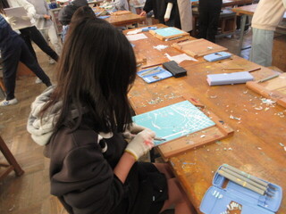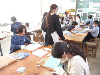 彫刻刀を使って版画の学習です。慎重に進めますが危険なので、チーム千鳥の方々も支援くださいました。いつもありがとうございます。