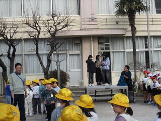 今日は、予告なしの火災を想定した避難訓練です。放送をよく聞き、行動します。
