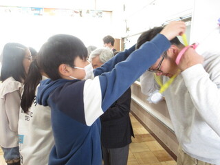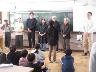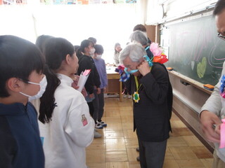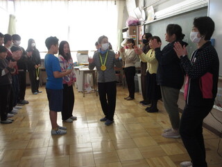 夏休みわくわくわくスクールの講師の方や毎朝の登下校に見守りなど支援いただいた方を招き、今日は校長室で給食を一緒にいただきました。6年生の卒業も近いということで6年生の教室に行くと、お礼の言葉やメダルも。見守り隊の方々も「毎朝、あいさつしてくれてとてもうれしかった。残りの日々も安全にみんなが登校できるようにがんばるね。」など、6年生へメッセージをくださいました。