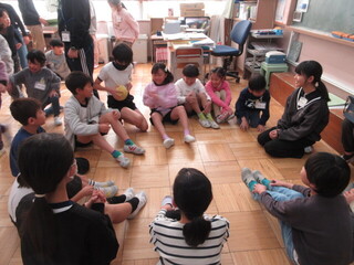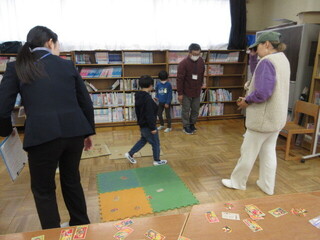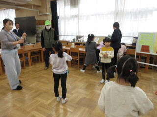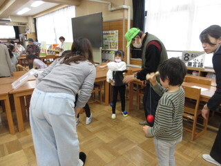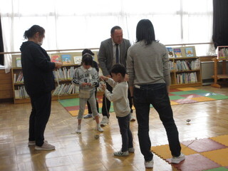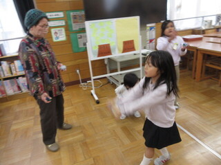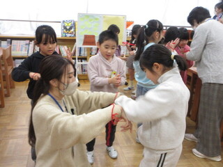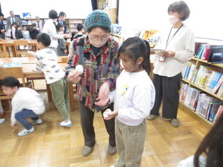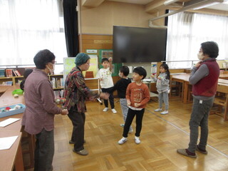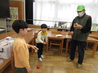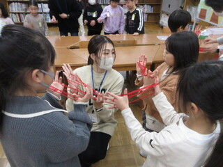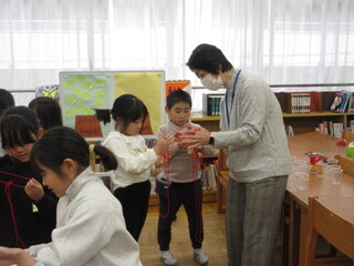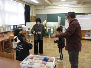 こどもたちは、けん玉やお手玉の「コツ」を教えてもらい、真剣に取り組んでいました。授業終わりには、「うまくなったよ」と嬉しそうです。あやとりは、延々と続けることができており、感心しました。どの遊びに対してもすぐに飽きるという子はおらず、どうにかうまくなろうと粘り強く取り組んでいました。たくさんの方々に囲まれて、こどもたちは安心して遊びに挑戦することができました。