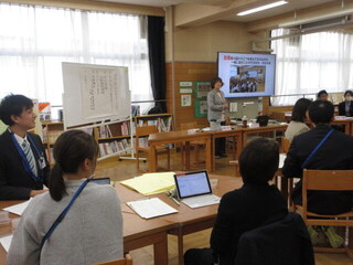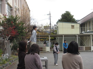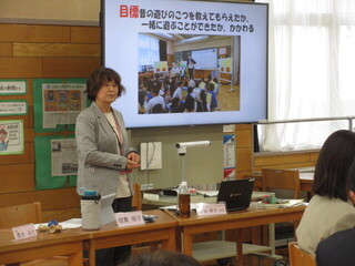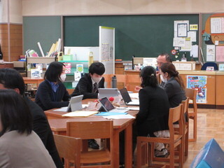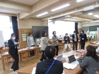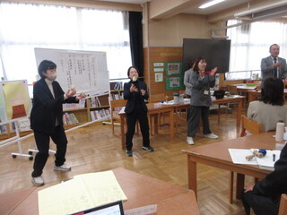 5時間目終了後は、区のSTEAM教育推進委員の大場寿子先生からご指導をいただきました。教員も昔遊びに挑戦しながらも、授業を振り返ります。こどもたちを中心に据えながらも、言葉でしっかりと感謝を伝えたり、コツを言語化したりする工夫を大切にしていかなければならないと感じました。