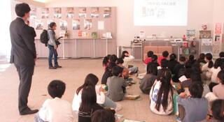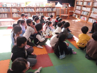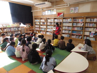 図書館で司書の先生の読み聞かせを真剣に聞いています。