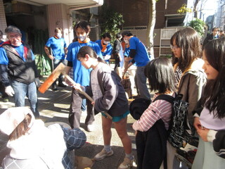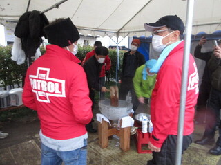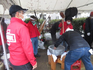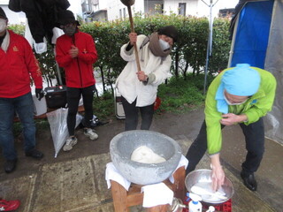 矢口北町会では「おもちつき」、千鳥北町会では「防災訓練とおもちつき」が予定されていました。当日は、雨が降っており、千鳥北町会の防災訓練は実施できず。ですが、あたたかい豚汁とつきたてのおもちをいただきました。矢口北町会では、おもちつきも体験させていただきました。予想以上の重さに驚きました。
