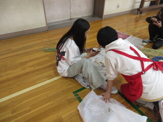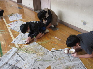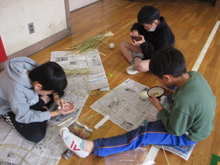5年生は、育ててきた稲の脱穀をしました。チーム千鳥の皆さんに丁寧に教えていただき、作業が進みます。すり鉢と野球ボールを使って、籾殻を取り除きます。一粒一粒を大切にしながら、黙々と作業に取り組んでいました。「食べるお米にするって大変」「農家の人たちってすごい」「こんな作業があるんだ」など、感想を伝え合いながら、皆、頑張りました。チーム千鳥の皆様、ありがとうございます。