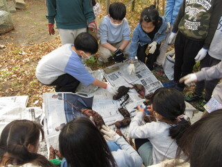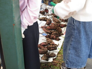 5年生の作業中、学級園では2年生が芋ほりを終えていました。立派なサツマイモがたくさん。こどもたちは、数を数えながら嬉しそうです。軍手も泥だらけになりましたが、「大きいお芋があったよ」「土の中に幼虫がいた」など教えてくれました。