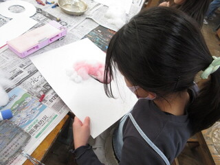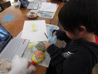 「フワフワさんのドアかざり」を制作していました。綿をつかってイメージを広げています。きれいな色を綿につけ、「空にしよう」「イルカだ」など、形を決めていました。