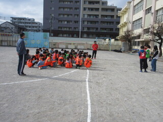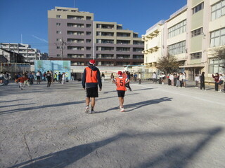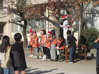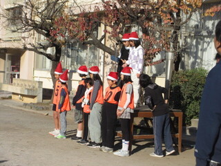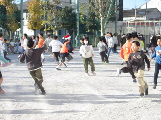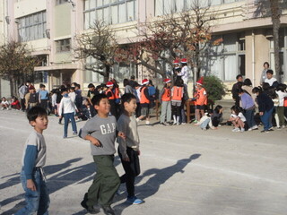 集会委員会主催の「サンタからにげろ」集会です。1~3年、4~6年に分かれて、集会委員会の児童やサンタ役の先生たちから逃げます。サンタの帽子を用意しており、鬼役(サンタ)は分かりやすくなっています。サンタ役として走り回りましたが、こどもたちは予想以上に早く、なかなかタッチできませんでした。朝から、たくさん動いて、楽しい集会になりました。