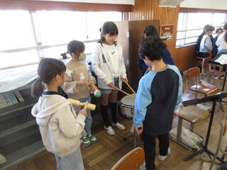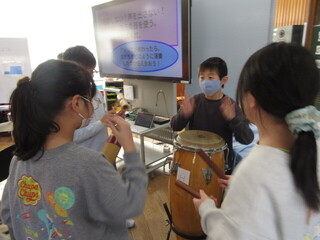 様々な楽器の音の特徴を生かし、これからアドリブで演奏する様子。まずは、班ごとにいろいろな楽器がおかれている箇所に時間で移動し、鳴らしてみます。楽器を譲ってあげている子や、楽しそうに音を鳴らす子など。あまり手にすることがない楽器もたくさんあり、こどもたちはわくわくするのではないでしょうか。