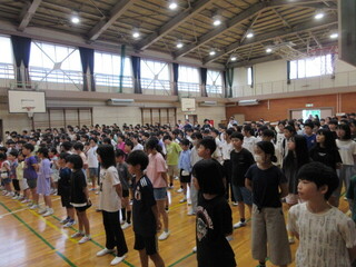 始業式では、夏休み前に伝えた「続けることを一つ」「心も体も元気に」「困ったら家族や先生に相談」について振り返り、二学期も継続してほしいことを伝えました。そして、「言霊」「言葉がもつ力」について話しました。二学期は、運動会や学習発表会など大きな行事もあります。自分の目標に向かって、仲間と共に助け合ったり、協力し合ったりするためにも、言葉を大切にしてほしいと思います。自分なりのペースでこつこつと目標達成、なりたい自分を目指して努力する二学期にしていきたいものです。