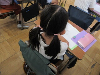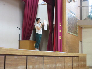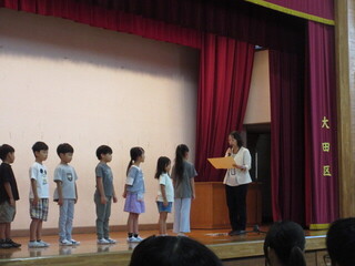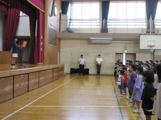 今回は、4年生が代表の作文を読みました。1学期を振り返り、しっかりと二学期に目標をたてることができていました。