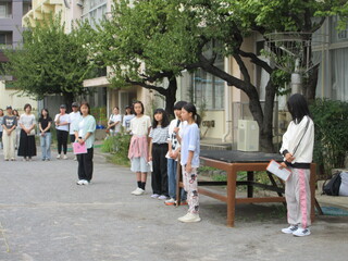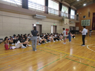 朝は、前期集会委員のメンバーによる最後の集会「逃走中」です。集会委員と先生たちが、タッチしていきます。