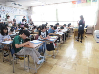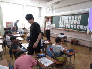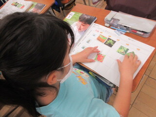 プリントのイラストから、アルファベットを探していました。なかなか難しい問題もあり、ALTの先生に積極的に質問しています。見つかると「な~んだ!」と嬉しそうです。