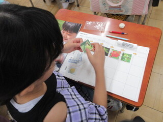 植物ごとにカードが用意されており、それを並べながら生長を振り返ります。様々な植物について同様にまとめた後に、縦軸で見ると共通点が。こどもたちが自ら発見し、ノートにまとめることができていました。また、ブロッコリーやたけのこ、じゃがいも、ねぎなどは根や茎、実などのどの部分を食べているのかをクイズ形式で考えました。