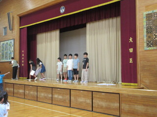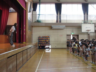 集会委員会による「物あて集会」です。後半には、ひっかけ問題のようなものもあり、全校で盛り上がりました。
