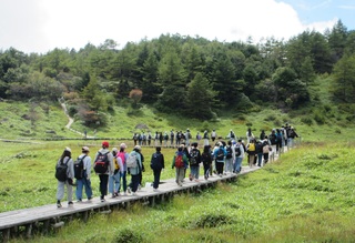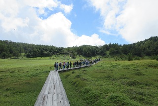 昼食のお弁当を食べ、いよいよ池の平、見晴岳のハイキングです。暑いくらいの天気です。