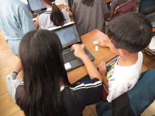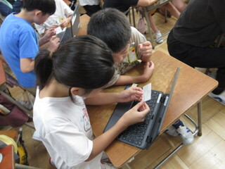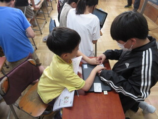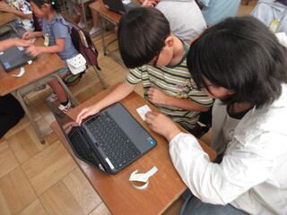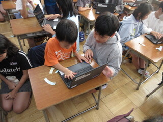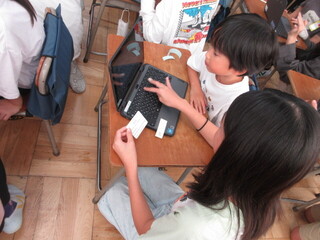 6年生が入力してくれるペアもあれば、1年生に「キーボードを打ってみる?」と促すペアもあります。6年生がそばで見てくれるので、1年生も心強いです。