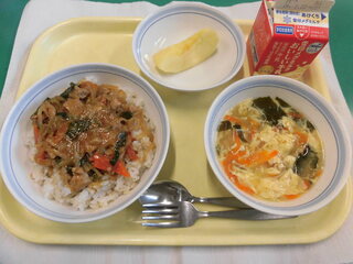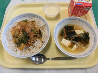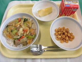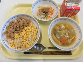 今日の給食は、栄養バランスがよくなるように考えて作りました。また、二色丼のような色どりのよい料理にして、みんなが食べたくなるように考えました。楽しみながら食べてください。
