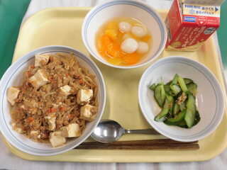 今日の給食には、麻婆豆腐焼きそばが出ます。さて、麻婆豆腐焼きそばに使われる麺として、一般的なのは何でしょう。