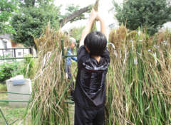本日は稲刈りと稲干しの作業を行いました。指先でひとつひとつ大切に植えた苗が、今では片手ではつかみきれないほど太く、高く育ちました。こどもたちも、稲の穂の重みをしっかりと感じ取っていたようです。