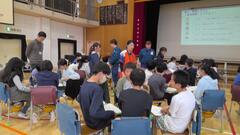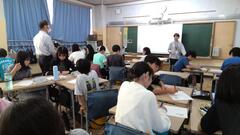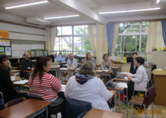 ドイツのテゥービンゲン大学から学生や先生方約60名が視察のために来校されました。給食準備から掃除の時間、昼休み、5時間目は4年生と6年生の授業を参観されました。その後の懇談会では、たくさんの質問がありました。「発言するときは、立つのが普通なの?」「個々に合わせた課題はあるの?」「1年ごとに先生は交代するの?」等、授業のことから学校の仕組みのことまで、ドイツのとの違いを私たち教員も知ることができました。