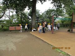 多摩川台公園でどんぐりや松ぼっくりなど秋のものを見付けたことや、「木の葉っぱが黄色くなっている。」と季節の変化に気付いたことをお互いに伝え合うことができました。