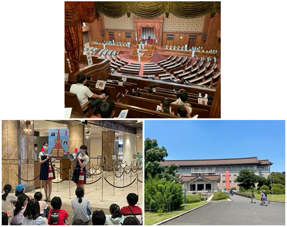 国会では傍聴席に座り、国会が果たす役割についての説明を聞きました。その後、東京タワーと国立博物館へ行き、グループで協力して見学したいところを選び、メモを取りながら学習しました。