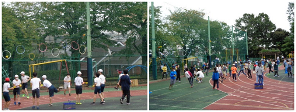 体力向上の取組として、8時30分から40分までの始業前までの時間を使って、学年単位で予定を立てて運動遊びを行うことにしました。12日は6年生、14日は4年生が「走」の運動遊びをテーマに折り返しリレーを楽しみました。