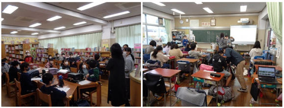 3、4年生は、校庭で運動遊びタイムを行いました。「言うこと一緒、やること一緒」という運動遊びを楽しみました。1、2年生はお話ポケットの時間で、PTA(お話ポケットサークル)の読み聞かせの方々の語りに聞き入っていました。