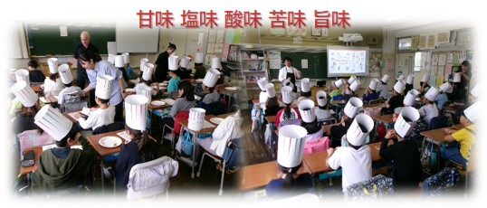 講師の先生方の工夫で、「甘味」「塩味」「酸味」「苦味」「「旨味」について、実際に味見をしたりクイズに答えたりしながら体験を通して学びました。