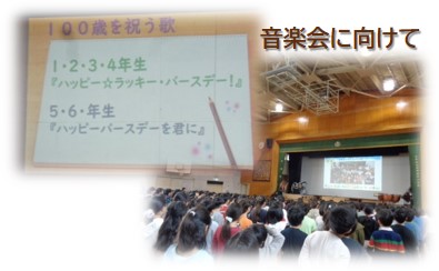 100周年記念の11月の音楽会に向けて、1~4年生は「ハッピーラッキーバースデー」、56年生は「ハッピーバースデーを君に」を歌いました。
