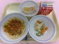 スパゲッティチキントマトソース ポテトフレンチサラダ 美生柑 牛乳
