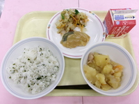 わかめごはん 鰆の西京焼き 鶏肉とじゃが芋の煮物 おひたし 牛乳