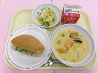 ハムサンド 秋野菜のクリーム煮 チーズいりサラダ 牛乳
