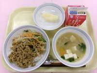 高野豆腐のそぼろ丼 じゃが芋のみそ汁 ごぼうのから揚げ 牛乳