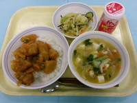 ごはん 芋と魚の甘酢あん 春雨スープ しおこぶあえ ジョア