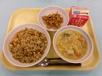 焼き肉チャーハン 玉子とコーンのスープ じゃこ大豆揚げ 牛乳