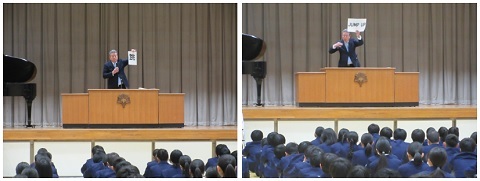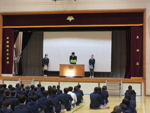 生徒会朝礼が行われ、「新年の抱負」についての発表がありました。「新年の抱負」は、昨年一年間を振り返り、新年に向けての目標や決意を新たにし、また、各学年の新年の抱負を聴くことにより、自分自身の新年の抱負への思いを深めることを目的とし、毎年、全員が冬休みの課題として書きます。提出後、各学年代表者1名を決め、この朝礼で発表しました。みな、真剣に耳を傾け、それぞれの新年の抱負を聴き入っていました。