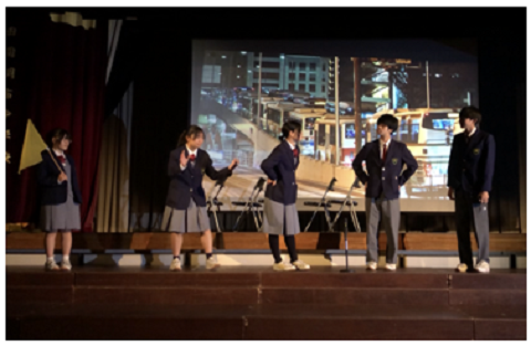 「青春賛歌~感動の最高到達点へ~」というスローガンのもと、学習成果発表会が開催されました。前半は、舞台発表でした。海外派遣報告、英語スピーチが行われた後、各学年の舞台発表が行われました。1年生は「野辺山、予想以上」というタイトルで、移動教室の様子を発表、2年生は「職場体験報告」、3年生は「中学校生活の集大成~修学旅行から考える私たちの未来~」というタイトルで修学旅行の様子の発表でした。3年生の発表は、全体の流れ、セリフ、魅せ方、すべて生徒たちが力を合わせて考えた発表で、最高学年らしいすばらしい発表でした。その後、吹奏楽部による演奏が行われました。