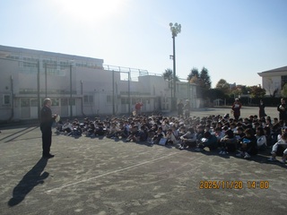 その後、生井先生から冬休みの生活指導のお話がありました。冬休みの合言葉「火・かね・車に気をつけて 相談しよう そうしよう」。特に、お金について気をつけることが説明されました。