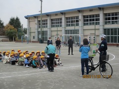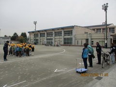 校庭にコースが設定され、何人かの児童が持ってきた自転車を使用して、3年生全員が乗車体験を行いました。交通安全課の方と警察の方のご指導のもと、保護者の皆様がコースの要所要所でアドバイスを送りながら体験することができました。初めて自転車に乗る児童はほとんどいませんでしたが、交差点や四つ角での左右確認、ブレーキの正しいかけ方など、技能と知識をしっかりと学ばせていただきました。ご多用の中、お手伝いをしていただいた保護者の皆様、自転車をお貸しいただきました保護者の皆様、ご協力ありがとうございました。