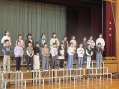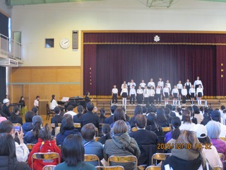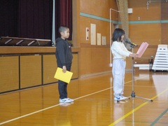 終業式では、校長先生より2学期のがんばりが話されました。気持ちの良いあいさつができるようになったこと、70周年の行事を立派にやり遂げたことなど、改めてお褒めの言葉をいただきました。児童代表の言葉は、2年生の倉石さんと行川さんが発表しました。2人ともがんばった学習のこと、3学期または3年生でがんばりたいことを、大きな声で堂々と発表することができました。最後は、元気に校歌を歌って終業式を終えました。