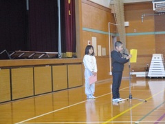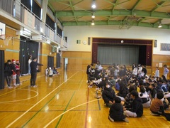 体育館の真ん中で集会委員が問題を出します