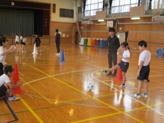 まずは、ブラインドサッカーの説明を受けてから、アイマスクをしている子と、していないガイド役に分かれて動きの練習をしました。その後、音の鳴るサッカーボールを使って、ガイドの指示に従い、ドルブルやシュートゲームを行い、楽しみながらもブラインドサッカーの難しさを体感しました。
